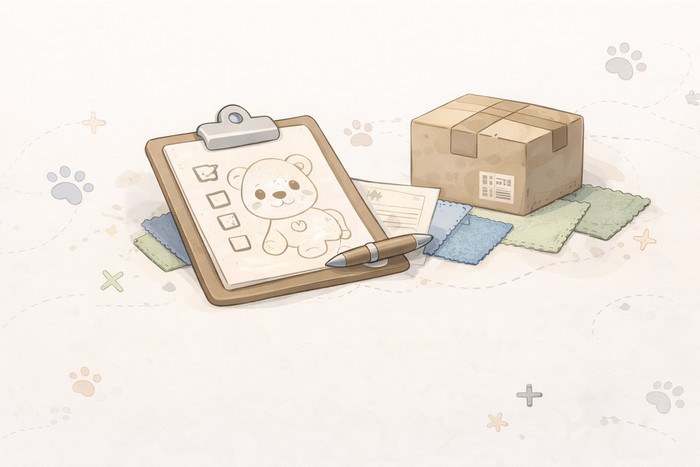 Recibimos la información del proyecto: tipo de peluche, volumen, uso comercial y necesidades específicas.